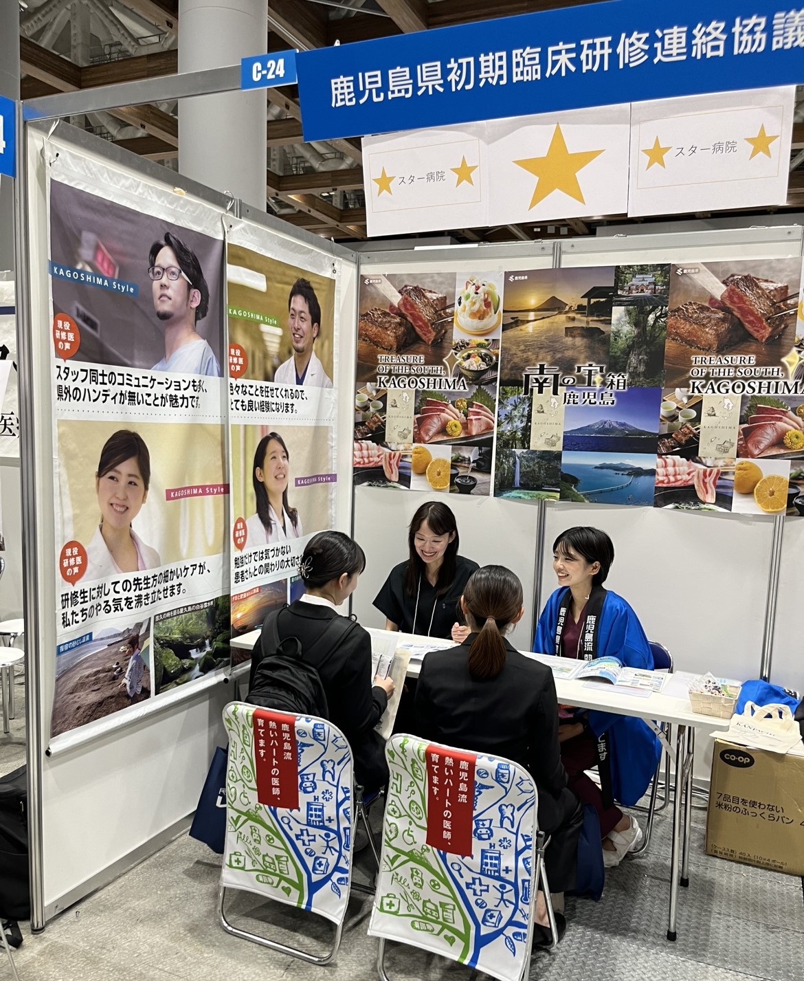レジナビ東京2025へ出展しました! 6月29日に東京ビッグサイトにて行われた「レジナビフェア2025東京」に、鹿児島県初期臨床研修連絡協議会として出展しました! 鹿児島県の医療に詳しいコンシェルジュと,鹿児島県立大島病院・南風病院の研修医の先生にご参加いただき,参加された医学生からの相談や質問にお答えしました。今後もイベントに出展する際はこちらのホームページでご案内しますので,興味のある方は是非チェックしてみてください!