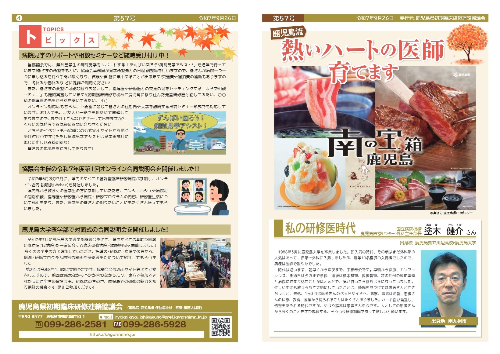 情報紙「~鹿児島流~熱いハートの医師育てます」 鹿児島県初期臨床研修連絡協議会では,初期臨床研修に関する情報提供を目的とした情報紙「~鹿児島流~熱いハートの医師育てます」を,定期的に発行しています。 医学生の皆さん,是非ご覧ください! 最新号 第57号(発行日:令和7年9月26日) 第56号(発行日:令和7年3月25日) 第55号(発行日:令和6年10月25日) 第54号(発行日:令和6年3月7日) 第53号(発行日:令和5年9月7日) 第52号(発行日:令和5年3月30日) 第51号(発行日:令和4年11月25日) 第50号(発行日:令和4年3月31日) 第49号(発行日:令和3年10月25日) 第48号(発行日:令和3年3月12日) 第47号(発行日:令和2年12月11日) 第46号(発行日:令和2年10月14日) 第45号(発行日:令和2年8月30日) 第44号(発行日:令和2年3月31日) 第43号(発行日:令和元年12月19日) 第42号(発行日:令和元年9月30日) 第41号(発行日:令和元年8月30日) 第40号(発行日:平成31年3月18日) 第39号(発行日:平成30年12月7日) 第38号(発行日:平成30年9月18日) 第37号(発行日:平成30年7月23日)